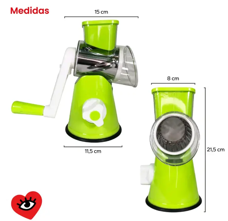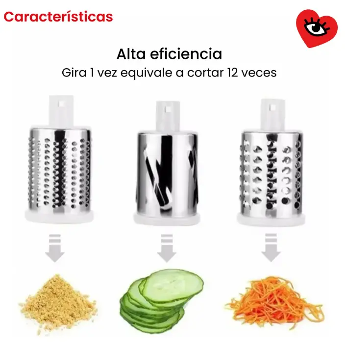 🍽️ Cortá y rallá verduras, quesos y más de forma rápida y segura. Incluye distintos cilindros intercambiables para lograr diferentes cortes, ahorrando tiempo en la cocina y facilitando la preparación de tus comidas diarias. Práctico, compacto y fácil de usar.